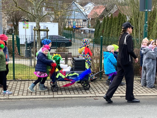 Das war gleichzeitig auch Verkehrserziehung ganz praktisch. Die Klasse übte das richtige Überqueren einer Straße und das Verhalten am Zebrastreifen mehrfach in der Praxis.