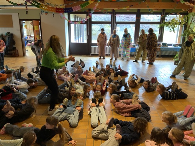 Nach dem ersten Teil stärkten sich alle an einem üppigen Buffet, das liebevoll von den Eltern der Klasse vorbereitet worden war. Anschließend tauschten die Kinder die Tische und Bänke des Klassenraums gegen mitgebrachte Kissen und Decken und richteten sich gemütliche Höhlen ein, um den zweiten Teil der Geschichte zu hören.
