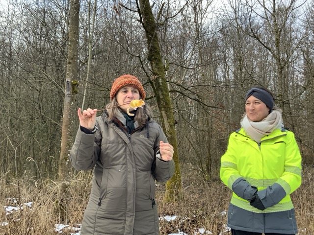 Ein besonderes Erlebnis war das Reiben an den Nadeln einer Douglasie. Förster Häffner zeigte uns, wie man mit den Fingern vorsichtig an den Nadeln reibt – und plötzlich roch es ganz intensiv nach Zitrusfrüchten oder Orangen. Der Duft kommt durch die ätherischen Öle und ist typisch für diese Nadelbaumart. Viele von uns waren überrascht, wie angenehm und frisch der Wald plötzlich duftete – ganz ohne Parfüm, dafür ganz natürlich.